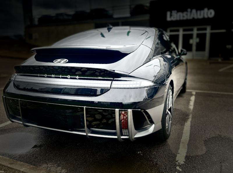 Maahantuojan sivustolla kerrotaan Ioniq 6:n olevan sähköisen aikakauden Streamliner, millä viitataan virtaviivaiseen muotoiluun. Kuutonen on kuitenkin 1,495 metrin lukemalla 5,4 senttiä korkeampi kuin Teslan Model 3 ja sen myös tuntee, kun autoihin istahtaa peräjälkeen. Kutoseen ei istuta likimainkaan niin matalalle, kuin kolmoseen. Sen sijaan 4,855 metrin mitallaan Ioniq on 13,5 senttiä pidempi kuin samainen Teslan malli. Ioniq 6:n kori on muotoiltu melko pitkälti maata viistävää puolikasta pisaraa muistuttavaksi. Edestä matalalta kiilautuvasti nouseva etupelti jatkuu tuulilasin jälkeen katon kaarena, mikä taittuu auton perään asti laskevaksi. Facebookin keskustelupalstojen perusteella kuutos Ioniqin muotoilu on kuin sähköautojen sinihomejuusto. Ilmeisesti suurin osa ei voi sietää sitä, mutta minä pdän etenkin mustalla värillä. Toki autossa ulkonäkö on ollut itselle aina täysin toissijainen seikka.