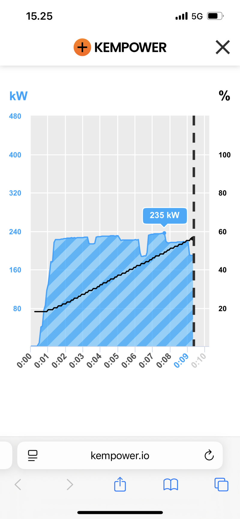 Onneksi mm navigaattori ja sen kautta akun esilämmitys toimivat. Latausteho onkin yksi tämän auton hienoimmista ominaisuuksista pienen kulutuksen lisäksi. 240 kW:n huipputeho ja moneen muuhun verrattuna laakea latauskäyrä lämmittävät paljon pitkiä matkoja ajavan mieltä.
