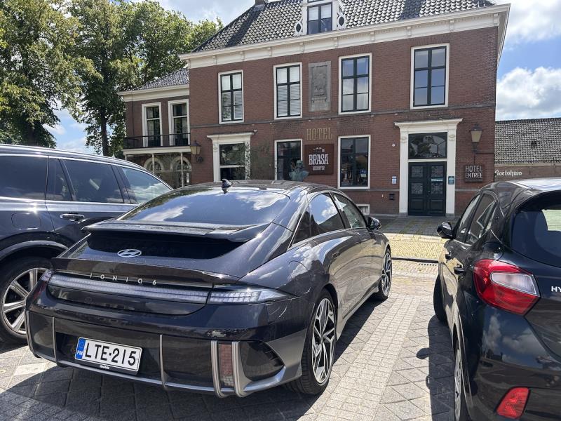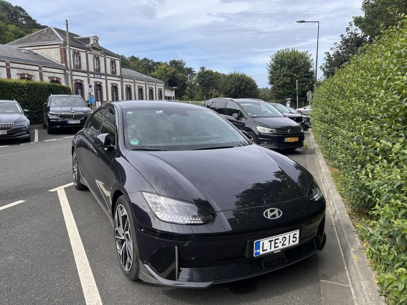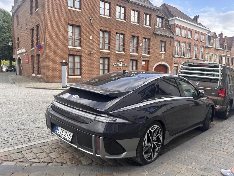 (jouduin muuten kuvakäsittelyllä yhdistelemään Ioniq 6:n kahdesta kuvasta yhdeksi, koska LED-valojen virkistystaajuus ja iPhonen kuvan taajuus menevät niin, että joka kuvaframissa oli vain osa valoista päällä. Onneksi käytössä oli iPhonen kameran automaattinen ajansiirtotoiminto, niin sain rakennettua kuvan, missä koko takavalo palaa, eikä näytä siltä kuin olisi rikki.)