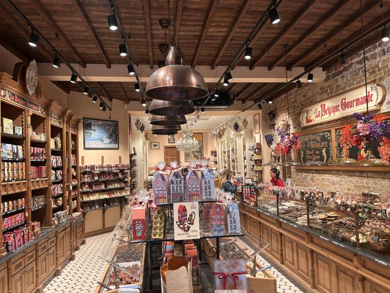 Brugge oli pullollaan suklaapuoteja, joista piti tietenkin ostaa hetisyötäväksi suklaata ja maremeladia, sekä kotiin tuomisia auton jääkaappiin. Belgiassa ja Bruggessa olisi ollut myös paljon tuliaisostoksiksi Tin Tin -tuotteita, mutta ne olivat sen verran arvokkaiksi hinnoiteltuja että jäivät nyt ostamatta. Hienoimpia olisivat olleet varmasti jo valmiiksi keräilyarvoakin omaavat ajoneuvot taidokkailla henkilö ja koira -figuureilla.