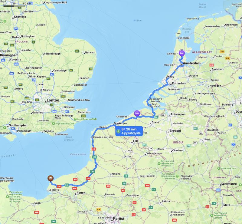 Étretat -jyrkänteiltä matka jatkui vielä samana päivänä kohti Belgiaa ja siellä kohteena Brugge. Matkaa oli 380 kilometriä, joten latasin kerran matkan varrelta.