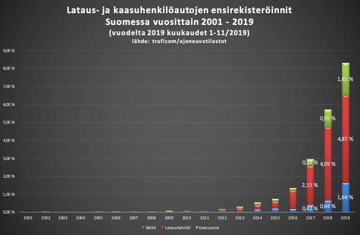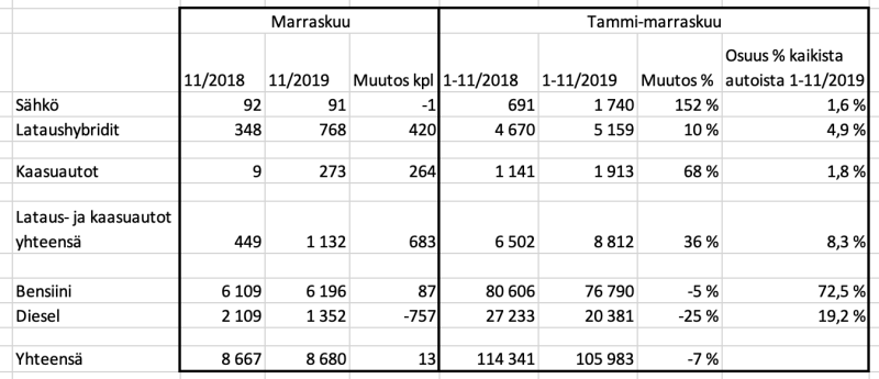 Vaihtoehtoisia energiamuotoja käyttävien, eli lataus- ja kaasuhenkilöautojen ensirekisteröinnit ovat jatkaneet muutaman vuoden ajan jo voimakasta markkinavaltaustaan. Nyt marraskuussa ollaan jo tilanteessa, jossa peräti 8,3 % uusien henkilöautojen ensirekisteröinneistä on ollut muita kuin bensiini- ja dieselkäyttöisiä. Voimakkain menettäjä on diesel, jonka ohi kaasu- ja latausautot tulevat menemään näillä näkymin jo ensi vuoden alkupuolella.