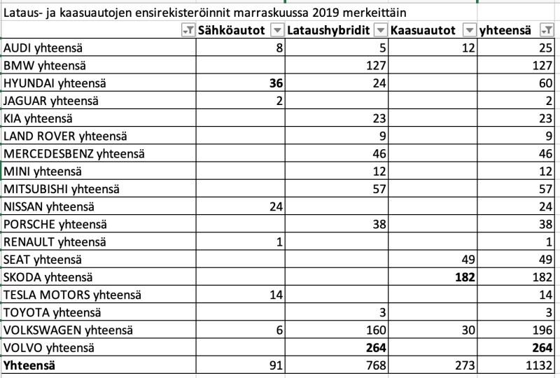 Mallikohtaisesti sähköautoista Hyundain 36 kappaletta on merkittävin, kun muut olivat tosiaan ensi vuoden tulossa olevaa rekisteröintipiikkiä odotellen kovin alhaisella tasolla. Lataushybrideistä Volvo veti jälleen pisimmän korren 264 kappaleellaan.