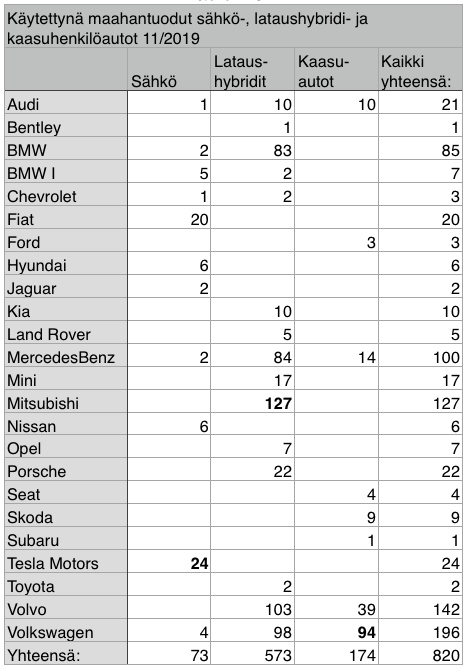 Käytettyinä yksittäin maahantuotiin marraskuussa yhteensä 820 sähkö-, latasuhybridi- tai kaasuautoa. Lataushybridit olivat jälleen ylivoimaisesti suosituimpia käytettyinäkin tuoduissa ja niistä Mitsubishi Outlanderilla jyrää edelleen. Kaasuautoista Volkswagen on eniten käytettynä tuotu ja sähköautoista Tesla.