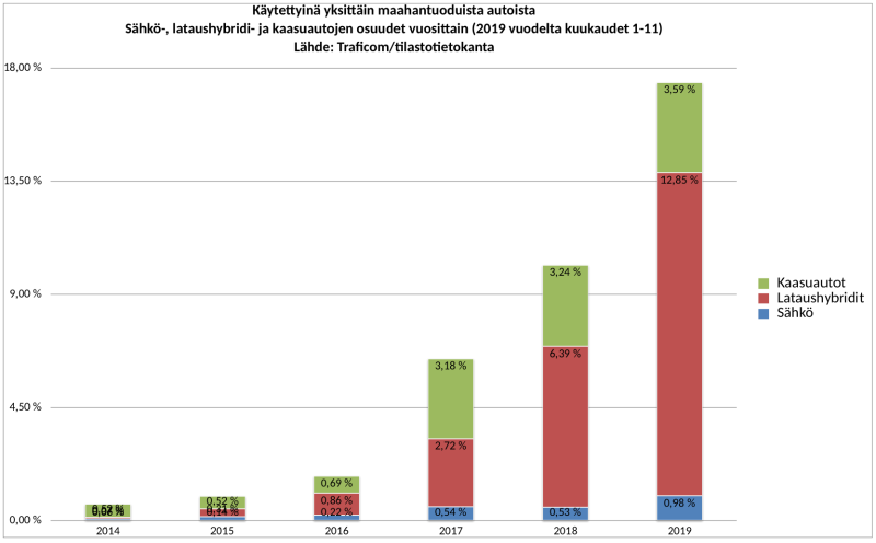 Vaihtoehtoisia energiamuotoja käyttävien ajoneuvojen osuus jatkoi vääjäämätöntä kasvuaan myös marraskuussa 2019
