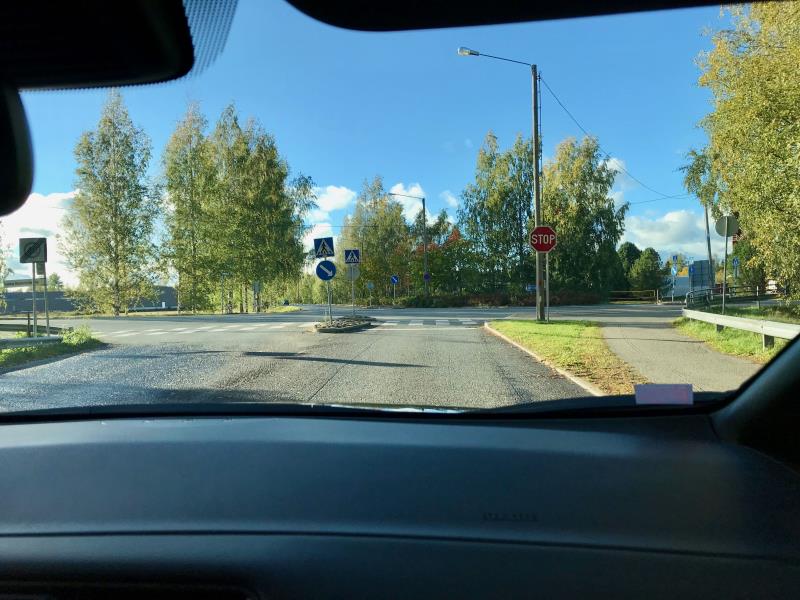 Heti ensimmäisiin risteyksiin saavuttaessa harjoiteltaviksi tuli ajoneuvon sijainti risteystä lähestyttäessä. Ensimmäinen risteys oli oikealle, joten vilkku oikealle ja ajoneuvoa ohjastettiin kaistan oikeaan reunaan. Risteystä lähestyttäessä huomioitavana oli risteävän liikenteen lisäksi kevyen liikenteen väylä. Muistutin risteyksen lähestyessä näiden huomioimisesta ja riittävästä vauhdin laskusta, jotta ehtii huomioida kaiken tarvittavan sekä reagoida tarpeen mukaan.