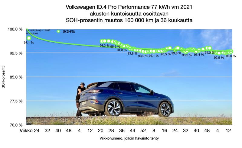 160 000 kilometriä ajetulle autolle tarkistukseni näytti akuston maksimikapasiteetiksi 71,6 kWh:n arvoa, eli SOH 93 %. Lukema on pyörinyt tuossa tasossa noin 50 000 - 60 000 kilometriä. Sitä ennemmin oli nopeamman laskun vaihe.