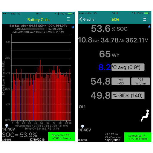Lähtöhetkellä ja siis täynnä ollessaan akuston 96 kennoa olivat hyvin tasapainossa. Eroa oli vain 10 mV korkeimman ja matalimman kennon varauksessa.