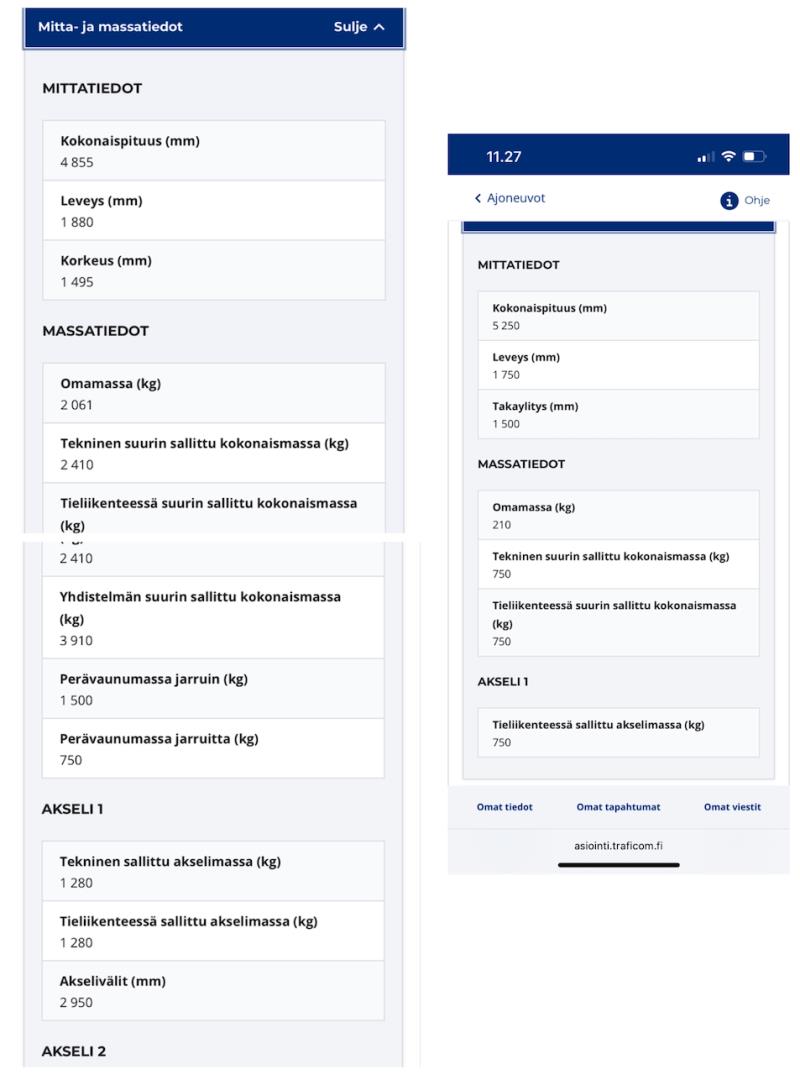 Otsikon kysymykseen on olemassa useampikin oikea vastaus. On se vastaus, mitkä vetomassat autolle on tyypitetty ja mitkä näkyvät Traficomin tiedoissa. Sitten on ajokorttini rajoitteet.