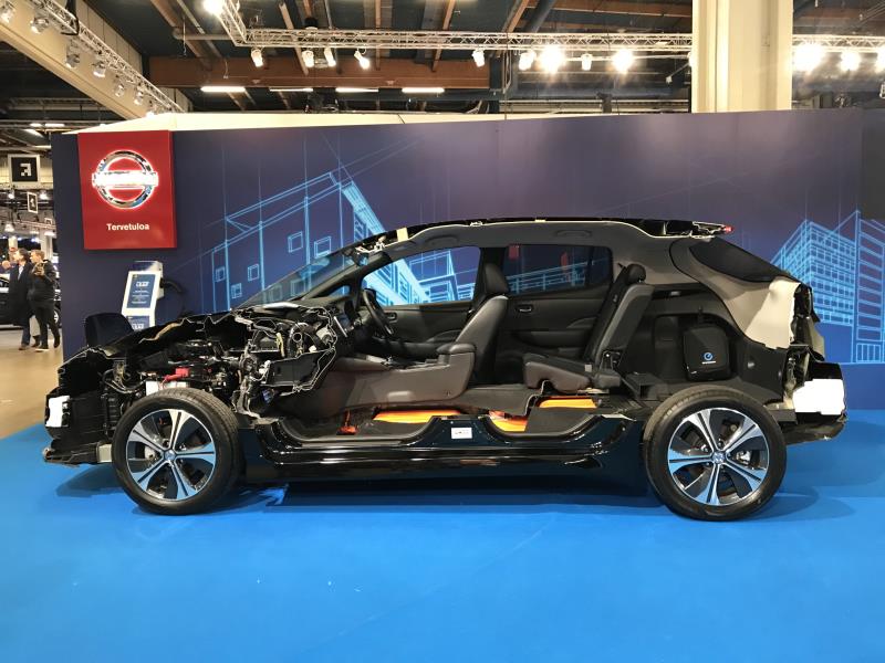Nissan oli tuonut messusosastolleen Leaf 40 kWh:n kokonaisena sekä puolitettuna. Leafi on minulle jo niin tuttu auto, että en sinänsä siitä enää jaksanut tutustumiskohteena innostua, mutta sitäkin mielenkiintoisempi oli tarkastella puoliksi leikattua Leafia.