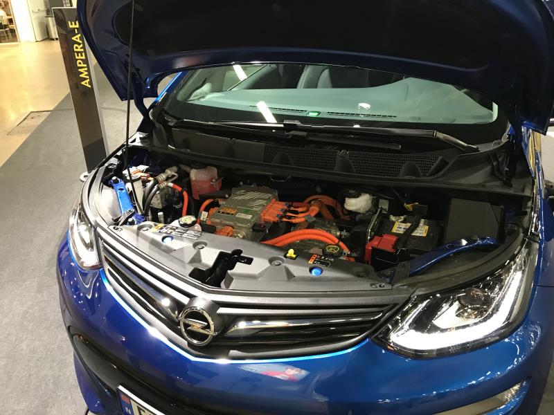 Nyt Helsingissä pääsin kurkistamaan myös Ampera-e:n konepellin alle. Frankfurtissa nimittäin messuesittelijät eivät millään suostuneet edes raottamaan keulapeltiä. Sieltä pellin alta löytyi todella tiiviisti pakattuna moottori, perä, invertteri, AC-laturi, ajoakku ja muut tekniikan komponentit. Ei siis etutarvaratilaa eli frunkkia, mutta eipä noin lyhyeen keulaan isoa tavaratilaa olisi mahtunutkaan.