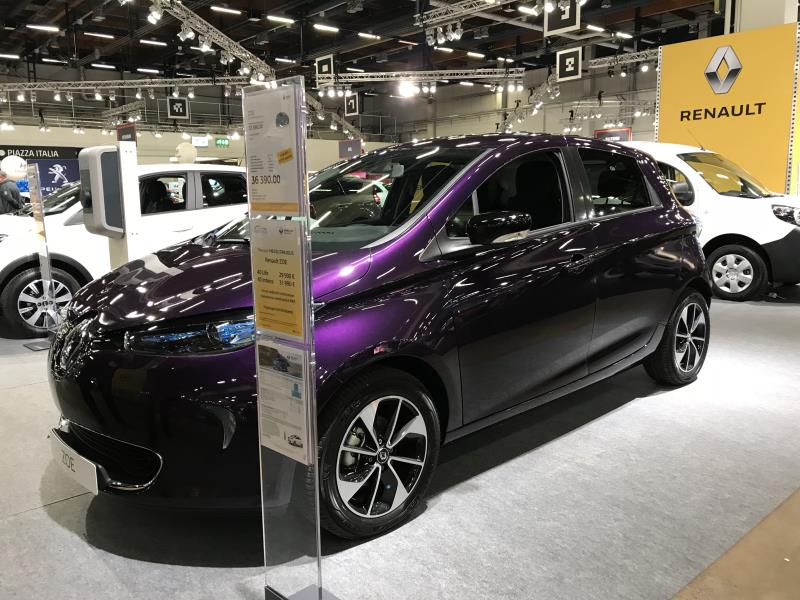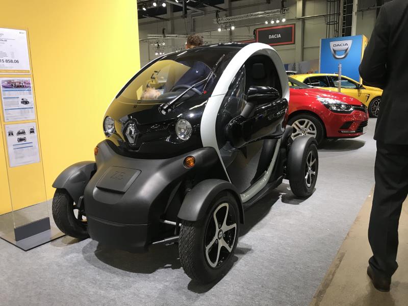 Renault oli tuonut messuille kolme sähköautoa. Twizyn saa rekisteröityä L7e ajoneuvoksi, jolloin autossa on 13 kW:n tehot ja huippunopeus 80 km/h ja ajaa voi B-ajokortilla. Sen saa rekisteröityä myös mopoautoksi, jolloin teho on rajoitettu 4 kW:n tehoon ja siis ajaa saa 15-vuotta täyttänyt mopokortilla.