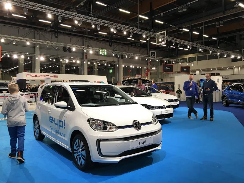 Volkkari oli tuonut messuille e-UPin ja e-Golfin. Näistä e-Golfilla olenkin ajellut ja kirjoittanut koeajoraporttini. E-Up on ehkä lähinnä kaupunkiajoon suuniteltu 18,7 kWh:n akulla varustettu sähköauto.