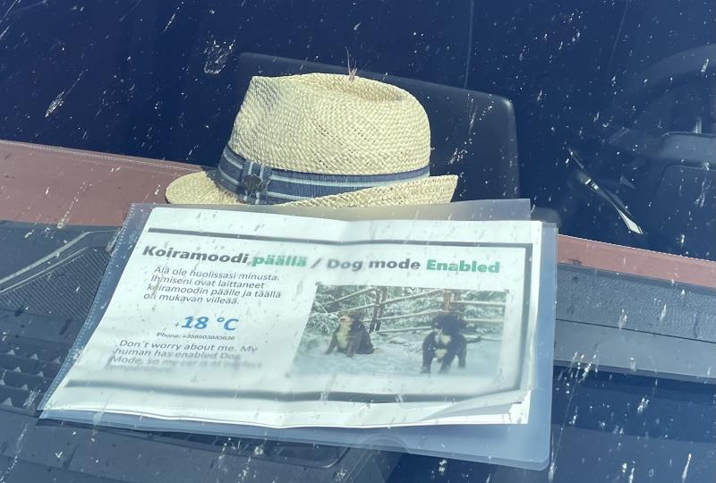 On kuitenkin syytä selkeästi informoida muita ihmisiä koirien hyvistä oloista pysäköidyssä ilmastoidussa sähköautossa. Meillä oli tuulilasilla ja etuistuimilla asiasta kahdella kielellä kertovat A4-laput puhelinnumerollani varustettuna ja säästyimme muiden ihmisten ylireagoinneilta.
