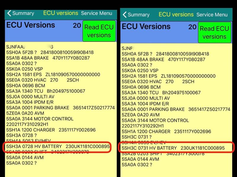 Tiesin, että 40 kWh Leafiin on saatavilla BMS-päivitys, joka toisi edes jonkinlaista helpotusta #rapdigate-ongelmaan, joten pyysin sitä päämäärätietoisesti Tampereen Autokeskukseen autoni 60.000 km huoltoon jättäessä. Olin tosin tätä pyytänyt jo huoltoa varatessakin, mutta jouduin silti vaatimaan päivitystä vielä autoa luovuttaessani. Päivitys tehtiin autooni pyyntöni mukaisesti ja se ilmenee oheisesta kuvasta punaisella ympäröidyn kohdan muuttumisesta. Kuva on LeafSpy-sovelluksen ECU-tiedoista.