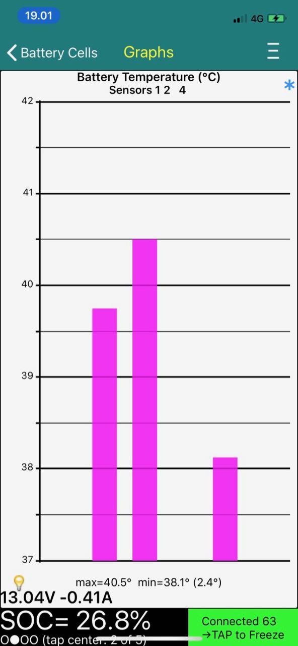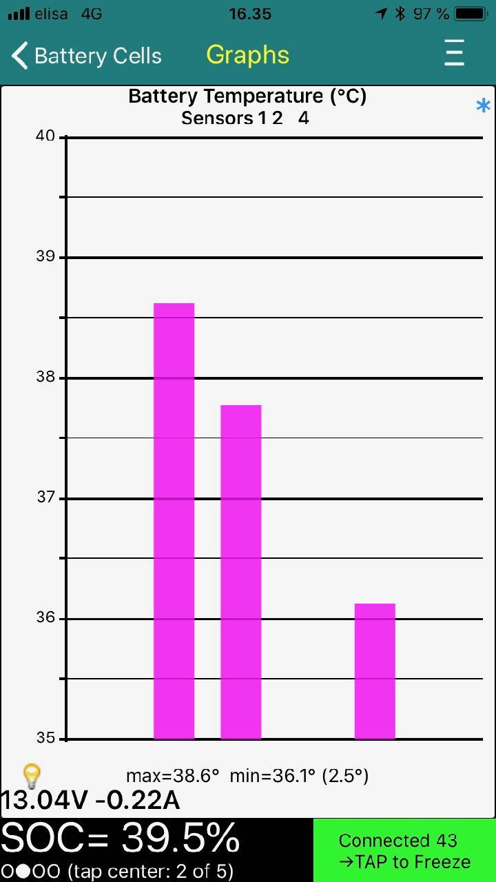 Ennen BMS-päivitystä viime kesän noin +27..29 °C lämpimillä keleillä ajettuani maantieajossa akun täydestä alle 40% tasolle, akku oli kuumentunut 36.1..38,6 °C välille ja jo ensimmäinen pikalataus saattoi rajoittua 31 kW:n tehon tasolle, kun parhaimmillaan se toteutuu noin 43-45 kW:n tasolla.