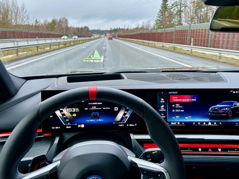 Moottoritielle päästyäni laitoin auton ohjailemaan ja säätelemään nopeutta tasan suurinta sallittua 100 km/h nopeutta. Silloin auton mittaristossa oli lukema 103 km/h. Bemarin ohjaamista avustava järjestelmä osaa myös taitavasti tehdä kaistavaihdot moottoritiellä ohitustilanteissa ja niitä riitti vaikka ajoin suurinta sallittua nopeutta. Jatkuvasti oli ohiteltavana polttomoottoritautoja, jotka varmaan säästelivät kallista polttonestettään.