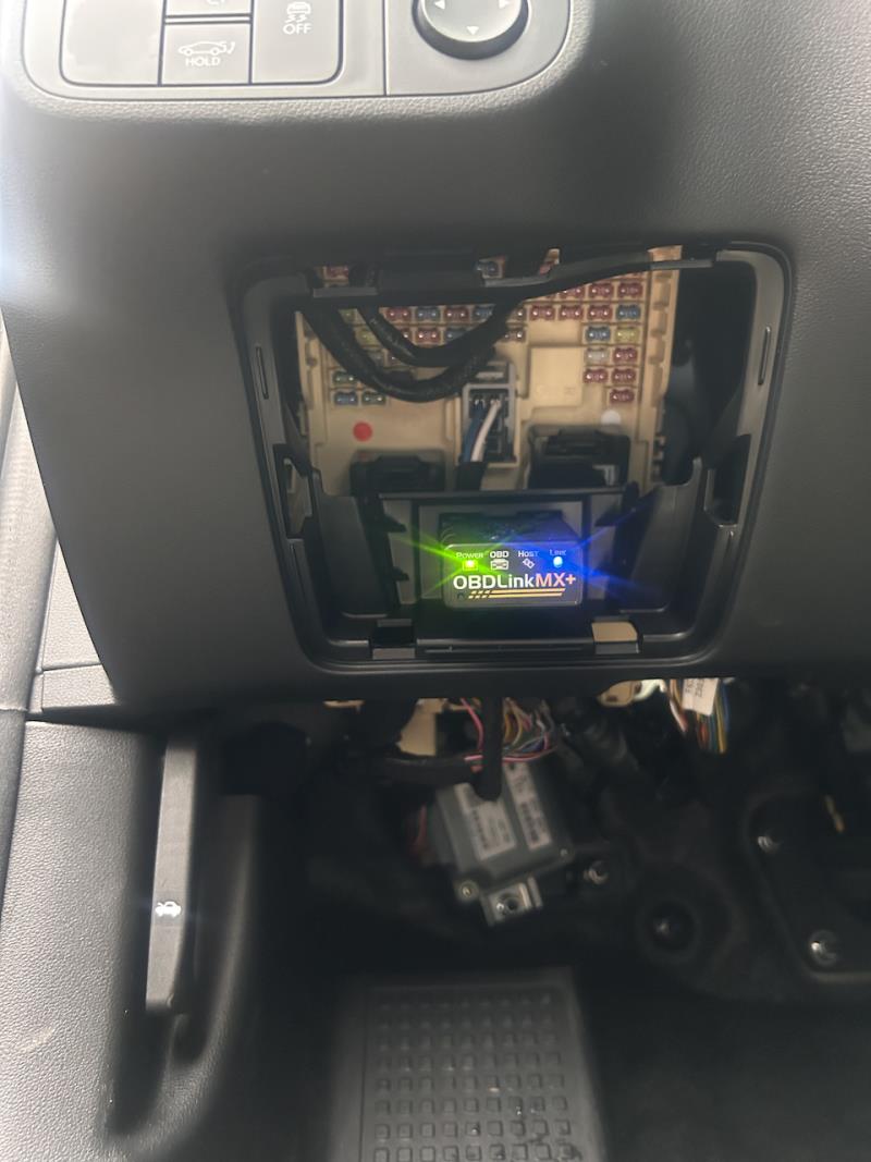 Ioniq 6 -sähköutossa OBD-portti löytyy helposti. Kuljettaja puolella kojelaudan alaosassa on muovipaneeleissa luukku, mikä aukeaa kevyesti hieman ylös ja taakse vetäen. Eli alaosassa on kiinnikkeet, miktä päästävät aukeamaan ja yläosassa on kiinnikkeet, mitkä toimivat ikäänkuin saranana kunnes koko luukun kannen ottaa pois. Pikaisesti katsottuna OBDLink-lähetin ei mahdu olemaan luukun alla, mutta minulle sillä ei ole väliä, koska poistan lukijan aina kun en sitä käytä ja asetan takaisin, kun haluan jotain tietoja autosta tutkia.