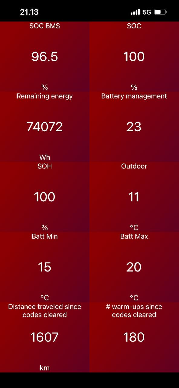 - SOC BMS %. Tämä on todennäköisesti auton näyttämän nollan prosentin varaustason sekä todellisen nollavaraustason suhdeluku. Eli luultavasti tässäkin sähköautossa on auton näyttämän SOC-nollan prosentin jälkeen vielä käytettävissä jokin energiamäärä. Kunnes saan asian selvitettyä, esitän vain arvauksena sen olevan jotain kolmen prosenttiyksikön tasoa. Oli 96,5 %