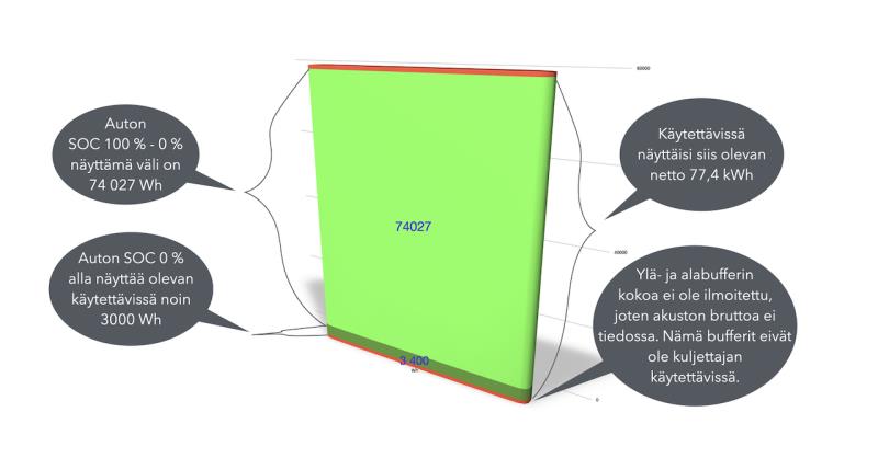 Mikäli akussa oli vielä tuossa kohtaa käytettävissä 5 %, olisi ilmoitetusta 77,4 kWh:n nettokapasiteetista 3,87 kWh. Silloin esimerkiksi oman mittaukseni 74,072 kWh + 3,87 kWh olisi yhteensä 77,942 kWh, eli autolle ilmoitettu 77,4 kWh pitäisi nettokapasiteettina paikkaansa.