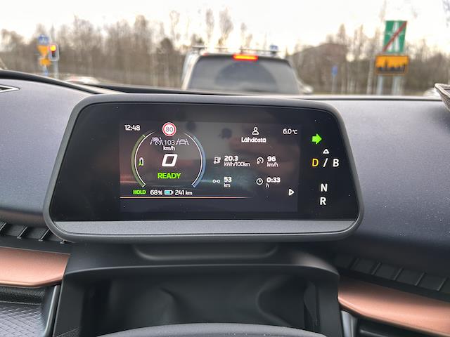 Ajoin reilun 50 kilometrin edestakaisen lenkin moottoritietä Tampereelta etelään. Koeajolenkkini siis vastaa suomalaisittain erittäin nopeaa maantieajon kulutusta. Keli oli +7°C ja tien pinta oli osittain kostea. Kulutuksessa on vain osuus juuri ennen moottoritielle liikennevaloista kiihdyttämistä päättyen liikennevaloihin pysähtymiseen moottoritien lopussa. Mukana on myös kääntöpisteen hitaammat kohdat. Keskinopeus toteutui 96 km/h ja keskilulutus oli 20,3 kWh, mikä vastaa täysin ennakko-odotustani.