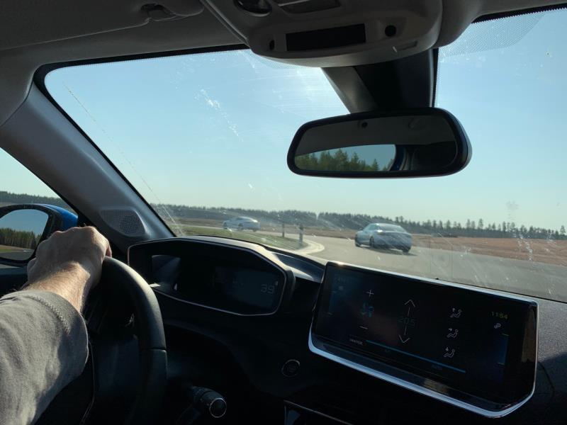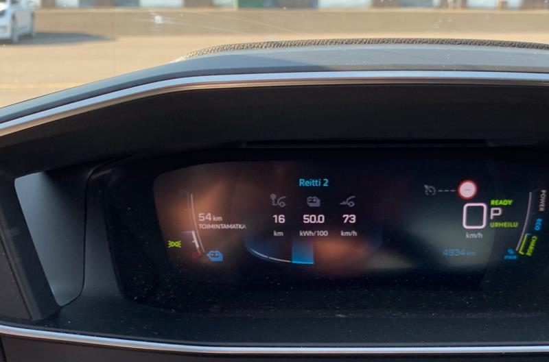 Nopeilla ratakierroksilla tuli pian vastaan e-208:n kulutusmittarin mitta-asteikon yläraja, kun kulutuksen kasvu pysähtyi 50 kWh/100 km lukemaan. Koska lukema lähti laskemaan vasta joidenkin kilometrien maantieajon jälkeen, päättelen todellisen kulutuksen olleen korkeammallakin. Valitettavasti e-208:iin en ole löytänyt LeafSpyn kaltaista sovellusta, jolla näkisin OBD-väylän kautta tarkempia tietoja, niin en tiedä nyt Pösöni todellista sähkönkulutusta rata-ajossa kovaa ajaessa.