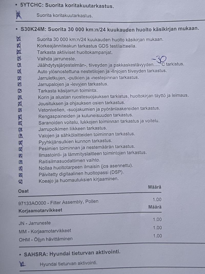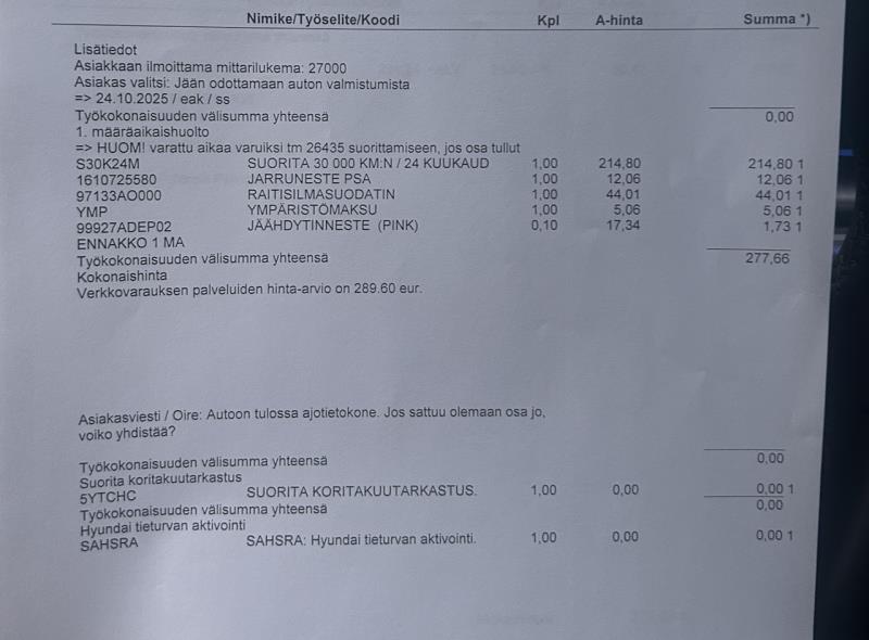 Hintaa 30 000 kilometrin huollolle kertyi 277,60 euroa, minkä lisään tällä 10.11.2025 päivämäärällä ajoneuvon kulujen seurantataulukkooni.