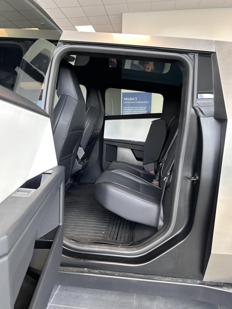 Avolava-auton keskeinen mitta on varmasti monelle lavan käytettävissä oleva koko, mutta Cybertruck tarjoilee erittäin väljät sisätilat neliovisessa matkustamossa. Sisätilojen ilme on tuttua Teslaa isolla keskinäytöllä sekä takamatkustajien näytöllä sekä muutoin pitkälle viedyllä minimalistisuudella.