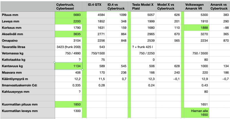 - Avolavaverrokiksi valitsin Volkswagen Amarok V6:sen. Siihen verrattuna Cybertruck on 38,3 cm pidempi, 29 cm leveämpi, mutta lähes 10 cm matalampi. Lava on Cybertruckissa lähes 20cm pidempi, mutta Amarokista löytämieni tietojen perusteella kapeampi.