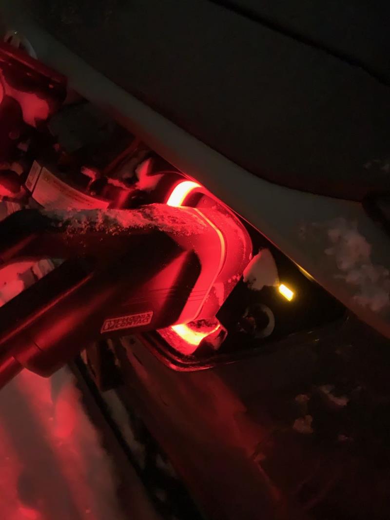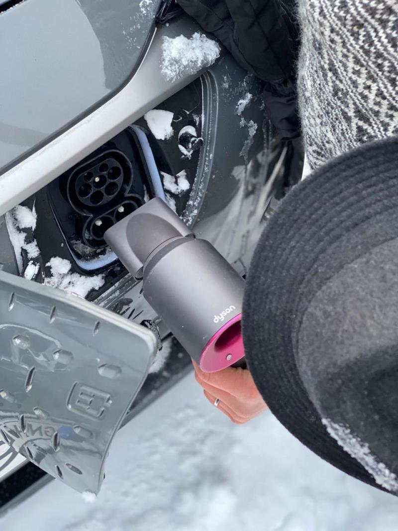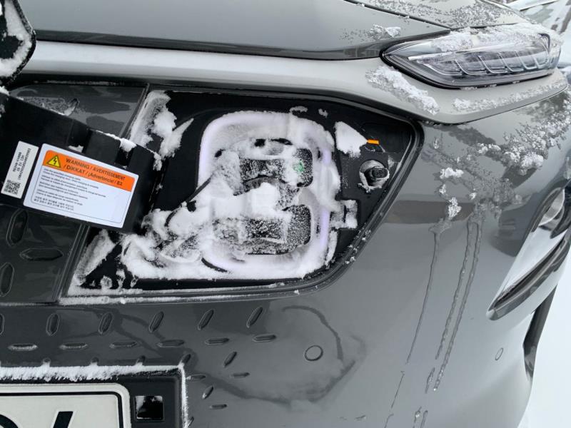 Latauksen käyntiin saaminen oli tällä kertaa merkittävästi normaalia haastavampaa ja ehkä jopa ärsyttävämpää. Konan keulassa oleva latausportti oli tuiskunnut täyteen lunta ja lataus ei suostunut käynnistymään. Mukanani ajaneen Teslan omistajalta lainasin jatkojohtoa ja Dysonin hiustenkuivaajaa hetkksi. Pikkuhetki lainatulla hiustenkuivaajalla puhallusta riitti sulattamaan auton liittimen. Onneksi Hyundain maahantuoja on jo sisäistänyt tämän ongelman ja autoihin on saatavilla täydentävä tiiviste latausluukkuun.
