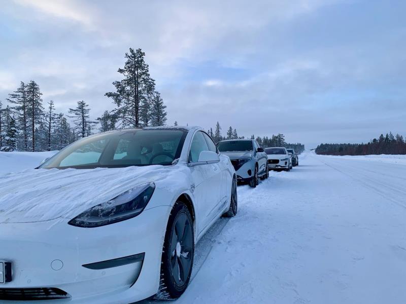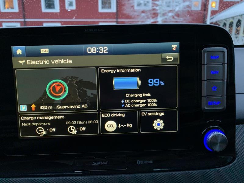 Teimme neljän sähköauton kanssa yhteislähdön Jokkmokkin hotellista sunnuntaiaamuna kello 8.40. Renault Zoe lähti hieman aikaisemmin johtuen muita pienemmästä akkukapasiteetistaan. Konan akku oli lähkön hetkellä 99% latauksessa. Yön aikana akku oli latautunut Trafomicin WALLe -latauslaitteessa. WALLe yhdistää kaksi vaihetta yhteen, joten jo 3x25A:n sulakkeiden takaa saatiin Konalle 32A:n, eli auton sisäisen laturin 7 kW:n tehon suurinta latausta. Auto oli siis ollut aamulla 100% täyteen latautunut, akku vain ehti kulua aamulla auton lastauksen ja yhteislähdön odottelun ja lämpinämä pitämisen aikana. Toimintamatkaa Kona lupasi lähdön hetkellä 349 kilometriä. Keli oli -3°C ja kuivaa pakkaslunta pöllysi tuulen mukana, joten melko ihanteellinen talvikeli sähköautoilulle.