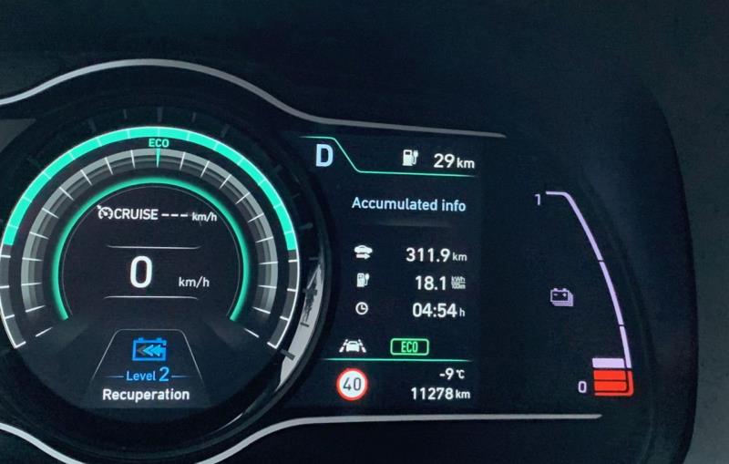 Mutta oma kokemukseni Konasta (40kWh). Kävin koeajamassa muutama viikko sitten. Tehtiin 196 km lenkki tai paremminkin moottoritiellä edes-takas reissu. Ei tullut perehdyttyä ajotietokoneen käyttöön kunnolla, eikä vakinopeussäätimeenkään, niin osattiin seurata vain ajettuja kilometrejä, akun varausnäyttöä ja jäljellä olevia kilometrejä. Myös ajonopeus oli hieman epätarkkaa. Edellä mainittuja kirjattiin 10km välein. Mutta tässä havainnot tiivistettynä: