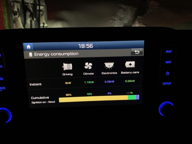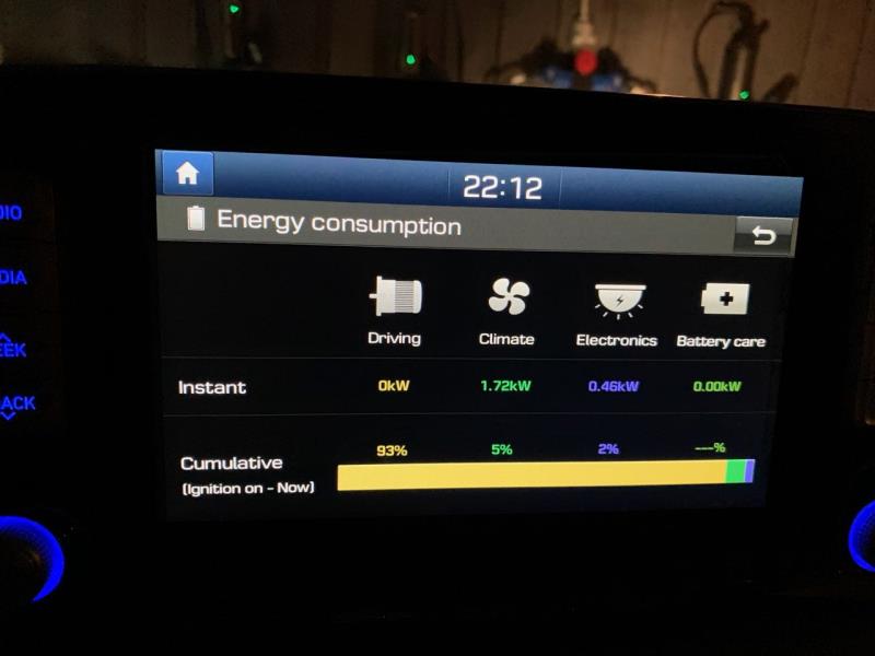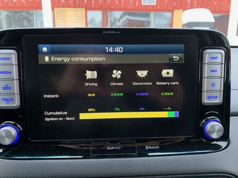 Auton 64 kWh:n akusta oli siis kulunut tähän mennessä noin 56 kWh:n verran energiaa. Kuluneesta eneriasta auton lämmittämiseen oli mennyt ainoastaan 7%, eli 3,92 kWh:n verran kuluneesta energiasta. Kun otetaan huomioon, että tuolla 312 kilometrin matkalla oli kulunut ajoaikaa 4 tuntia ja 54 minuuttia, niin auton sisätilojen lämmittämiseen oli kulunut noin ainoastaan noin 800 Watin verran tehoa keskimäärin koko matkan aikana. Se on todellla vähän, kun ottaa huomioon, että pakkanen vaihteli pääsääntöisesti - 6..-12°C välillä.