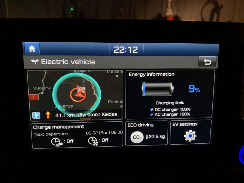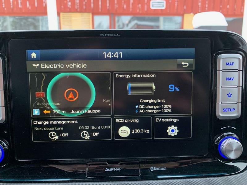 Lapland hotellille saapuessa Konan matkamittari näytti kertyeen 312 kilometriä lisää aamun lähdöstä alkaen. Toimintamatka-arvioksi auto näytti 29 kilometriä ja 9% varaustilaa. Konan keskikulutus oli jälleen aikaisempien kokemustenikin mukaisesti erittäin maltilliset 18,1 kWh/100 km.