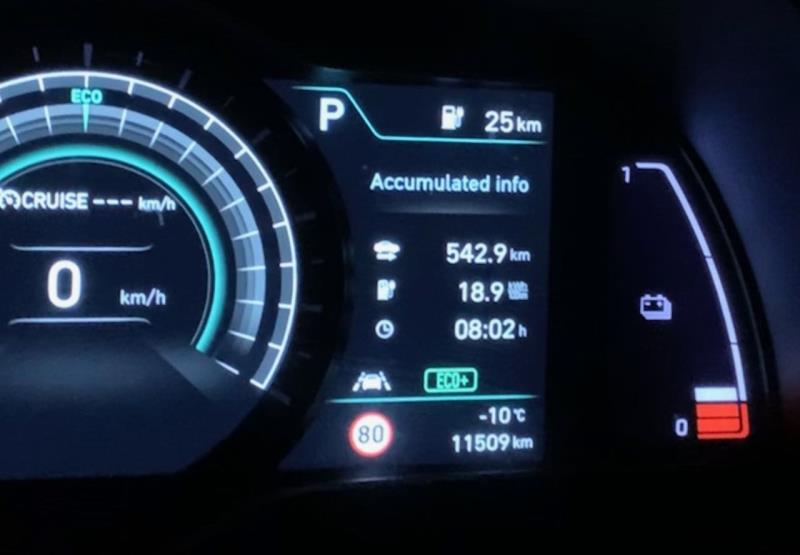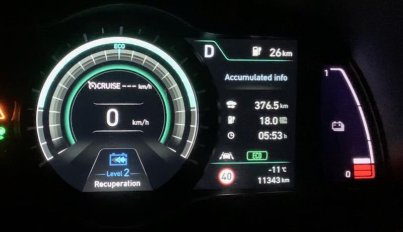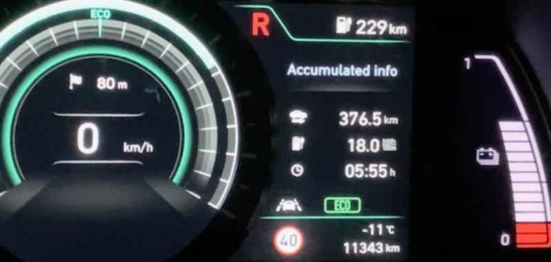 Alussa ladattiin 88%:iin, jäljellä olevat (jo) kilometrit näytti 232km. Auto aika ulkolämpötilassa. Ajettiin 97km moottoritietä yhteen suuntaan, navakassa sivutuulessa ja noin -3C lämpötilassa ja n.82km/h. Kääntöpaikassa (97km) varausmittaus näytti 52% ja jo. kilometrit 138. Sitten ajettiin takaspäin samaa tietä ensin n.85km/h. 142 km kohdalla varaus näytti 30% (jo. kilometrit 82) jolloin pysähdyttiin ja ladattiin akku 80%:iin (jo. kilometrit nousi 204km:iin). Sitten 95 km/h nopeudella loppumatka viimeisten kilometrien taajama-ajoa lukuunottamatta. Lopussa 196 km, varaus 57% ja jo kilometrit 144.