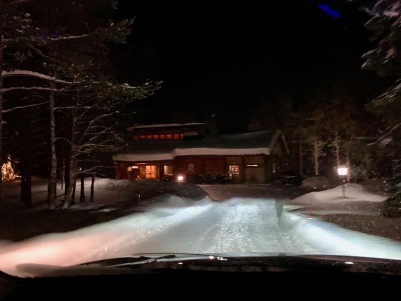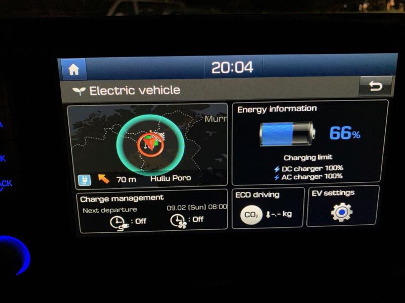Kona lupasi Leviltä lähtiessä toimintamatkaa 229 kilometriä akun varaustilan ollessa 66%. Matkaa perille kohteeseen Pyhällä olevaan Sunday Morning resort -majoitukseemme oli 166 kilometriä jäljellä, joten minulla ei olisi mitään energian säästelytarpeita. Ajoin kuitenkin samoilla asetuksilla kuin muunkin matkan. Eli Eco+ ajomoodi, tavoitelämpö 17°C ja driver only -valinta käytössä. Autossa tarkeni aivan hyvin. Pari kertaa jouduin sulattamaan ikkunat tuulilasin maksimipuhalluksella.