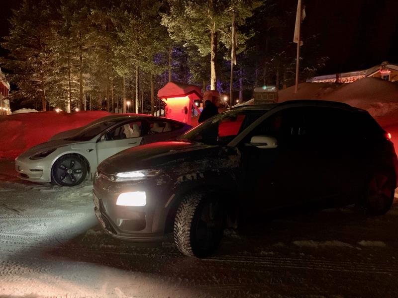 Jätimme molemmat autot latautumaan ja menimme Teslailijoiden kanssa yhdessä hotellille lounastamaan maukasta Pizzaa ja hamppareita. Lounastamisen ja kahvittelun jälkeen Teslan akussa olikin jo ylimääräistäkin energiaa, joten lähdimme käymään yhdessä Teslalla Jounin kaupalla. Kun Teslan lataus lopetettiin, nousi Konan latausteho välittömästi noin 5,5 kW:n tasolle. Jostain syystä siis vieläkään tässä latauspaikassa Kona ei saanut täyttä 7 kW:n AC-lataustehoaan. Palasimme noin puolen tunnin päästä kaupalta hotellille takaisin ja Tesla jatkoi matkaansa kohti Levin pikalaturia ja minä jäin odottelemaan Konan hitaamman latauksen nostavan akun energian riittävälle puskuritasolle. Nimittäin pohjoisen talvessa on varattava pakkasen kiristymisen varalle etenkin illan pimentyessä akkuun hiukan energiapuskuria. Myös maaston korkeuserot ovat pohjoisessa suuria ja niihinkin kuluu josku ylimääräistä energiaa.