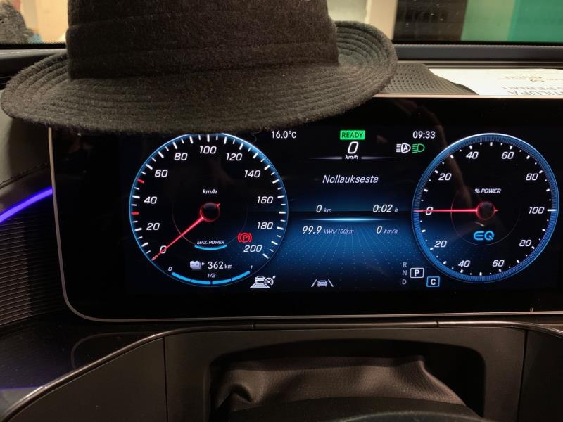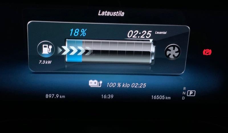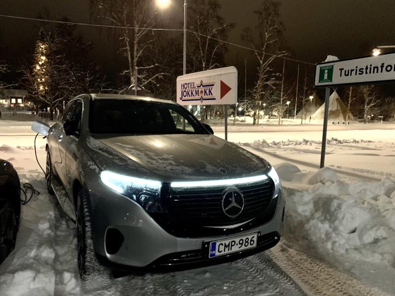 Laitoimme auton saamaan 7,3 kW:n tehoista AC-latausta mukaani ottamalla kolmivaihepistorasiasta virtansa ottavalla säädettävällä latauskaapelilla. Hotellilla illallisella totesin , että hienosti toimii Mersun sähköauto talvisissakin olosuhteissa. Iso ja tehokas nelivetoinen vaatii toki veronsa muita runsaammin kuluvan sähkön muodossa, mutta auto on kyllä mukava ajaa ja todella hiljainen.