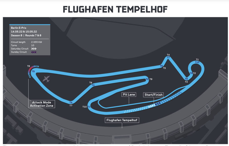 Tempelhofin lentokentällä oleva rata on 2,355 kilometrin pituinen ja siinä on kymmenen käännöstä. Rata ajetaan kahtena päivänä peräkkäin, mutta päivien välillä kiertosuunta vaihtuu ja näin rata tuntuu kilpailijoillekin erilaiselta. Rata on betonimuurein ja rautalanka-aidoin rajattu turvalliseksi, mutta ajopinnan pomppuisuuden pystyy näkemään autojen käyttäytymisestä kisan aikana.