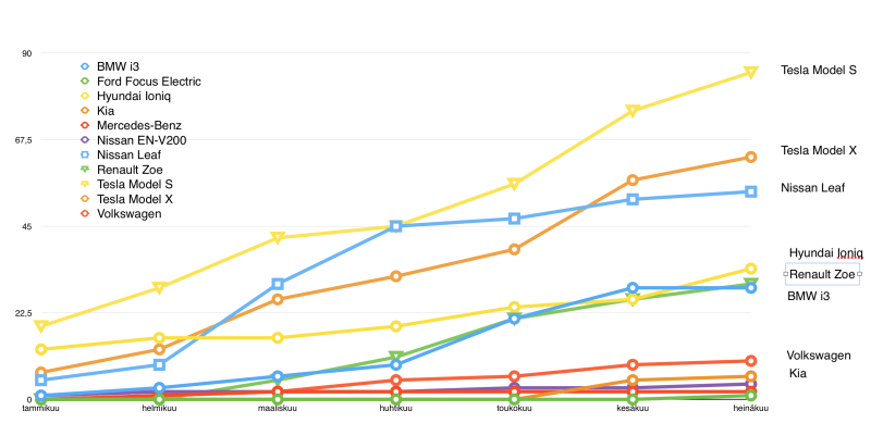 Heinäkuun mallikohtaiset BEV rekisterintiäärät