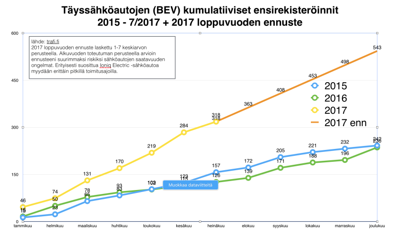 Alla olevaan kuvaajaan olen päivittänyt sähköautojen ensirekisteriöintien kumulatiivisen kokonaismäärän. Heinäkuu mukaanlukien on siis tänä vuonna uutena ensirekisteröity yhteensä 318 sähköautoa. Alkuvuoden keskimääräisellä tahdilla laskettuna loppuvuoden ennuste on nyt yhteensä 543 sähköautoa.