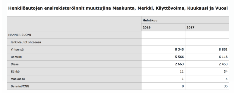 Heinäkuussa kaikilla muilla, paitsi dieselillä käyvien ajoneuvojen ensirekisteröintimäärät kasvoivat. Kuten alla olevasta taulukosta näkyy, ovat bensiini- ja diesel-käyttöiset autot edelleen Suomessa ylivoimaisesti eniten rekisteröityjä. Näin varmasti tulee olemaan vielä melko pitkäänkin.