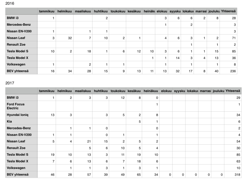 Heinäkuun kantaluku viime vuodelta on kovin alhainen, joten rekisteröintimäärän kolminkertaistuinen ei ollut kovinkaan suuri ponnistus. Kokonaismäärä 34 kpl oli toiseksi pienin tänä vuonna. Heinäkuun 2017 ensirekisteröintien määrä on täsmälleen sama, kuin kaksi vuotta sitten heinäkuussa. Kaksi vuotta sitten syynä vuoden toiseksi korkeimpaan rekisteröintikuukauteen oli voimakas Teslan Model S:ien toimituspiikki (32kpl).
