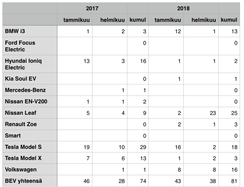Minun vertailussani lasken sähköautoihin mukaan myös BMW i3 REX -mallin. Yhteensä näitä autoja on tammi-helmikuussa rekisteröity hieman viime vuotta enemmän. Tästä kuitenkin merkittävin osa on nyt helmikuussa rekisteröityjä Nissan Leafin 40 kW -malleja. On uskottavaa, että näistä Leafeista iso osa on maahantuojan jälleenmyyntiverkostoon rekisteröityjä koeajoautoja.