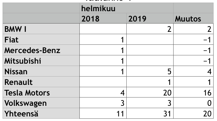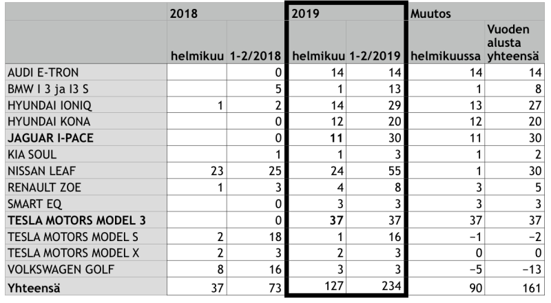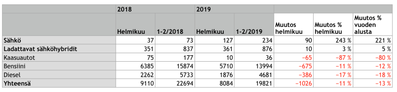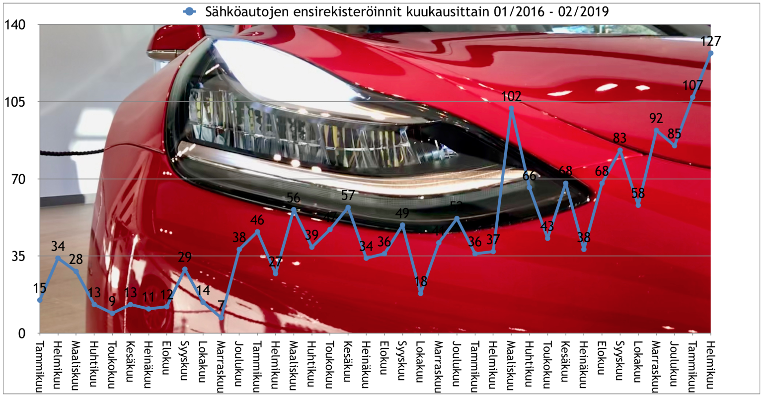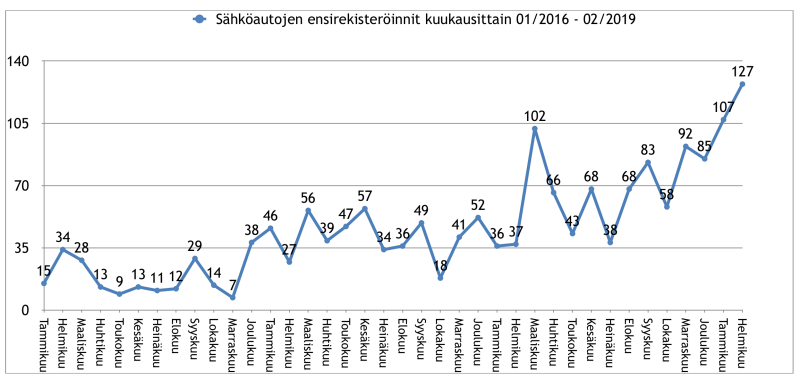 Helmikuussa 2019 ensirekisteröitiin 127 kappaletta täyssähköisiä henkilöautoja Suomessa. Tämä on kaikkien aikojen suurin määrä yksittäisen kuukauden aikana. Myös ladattavien hybridien ensirekisteröinnit olivat hyvällä kehityksellä. Kaikkien muilla käyttövoimilla kulkevien ajoneuvojen ensirekisteröintimäärät laskivat.