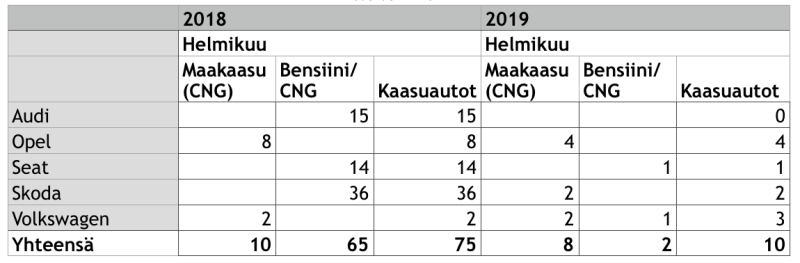 Kaasuautoja tuotiin myös runsaasti käytettyinä helmikuussa 2019 maahamme, yhteensä 123 kappaletta. Käytetyissä kaasuautoissa suosituin merkki oli Volkswagen.