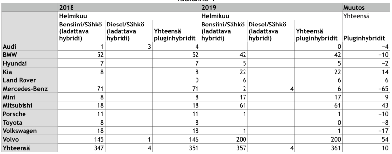 Pluginhybridien myynti kehittyi myös, mutta huomattavasti sähköautoja vähemmän. Plugareista jälleen ylivoimaisesti suosituin oli Volvo. Diesel-plugarit ovat melko harvinaisia Suomessa ja tämä johtunee kovasta verokohtelusta.