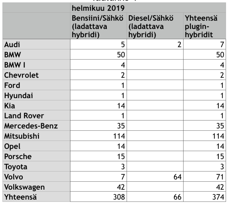 Pluginhybridejä tuotiin helmikuussa paljon Suomeen, yhteensä 374 kappaletta. Suosituin oli Mitsubishi, joka tarkoittanee käytännössä Outlander hybridiä.