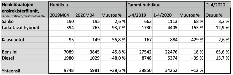 Huhtikuussa kaikkien uusien henkilöautojen ensirekisteröinnit sukelsivat peräti -38,6% laskuun, mutta sähköautojen 195 kappaletta oli lievällä 2,6% kehityksellä. Lataushybridien määrä oli edelleen korkealla 763 kappaleen tasolla ja peräti 93,7% kehityksellä. Suurimmat menetäjät jälleen olivat beniini- ja dieselautot.