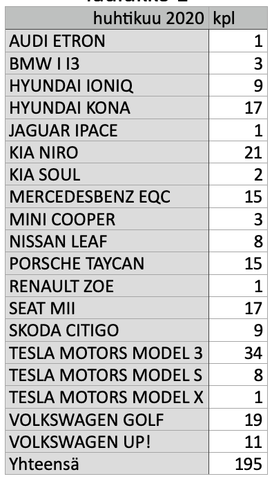 Sähköautoista eniten rekisteröitiin huhtikuussa Teslan Model 3:sia 34 kappaleella. Kia Niroa on saatu Suomen rekisteriin hienosti peräti 21 kappaletta. Hyvin arvokkaita Mersun ja Porschen sähköautoua on molempia rekisteröity peräti 15 kappaletta. Hienona yksityisohtana huhtikuun tilastossa pidän kolmen Minin ensirekisteröintiä. Niidenkin pää on nyt Suomessa siis auki.
